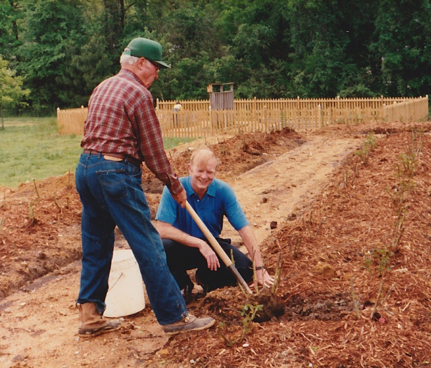 Gene Strowd (l) and Ed Norfleet(r) planting Gene’s roses in the rose garden.